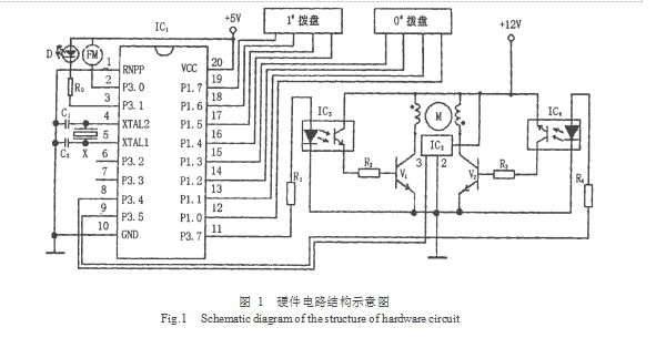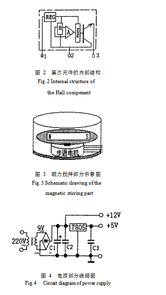 本機的硬件電路由控制部分、隔離放大部分、執(zhí)行部分、反饋檢測部分和電源部分等單元組成。硬件電路結(jié)構(gòu)如圖 1 所示?;竟ぷ鬟^程如下 :89C2051 單片機從 P1 口讀取兩只十進制編碼開關(guān)的設(shè)定值, 根據(jù)設(shè)定值產(chǎn)生 2 路定寬調(diào)頻時序脈沖控制信號, 2 路時序脈沖控制信號經(jīng)P3 .4口和 P3 .5口分別送**光電耦合器 IC3 和 IC4 隔離,再經(jīng)功率驅(qū)動電路放大驅(qū)動步進電機;步進電機的旋轉(zhuǎn)動作由霍爾傳感器 IC2 檢測, 反饋回單片機 P3 .4 口, 以判斷步進電機的運轉(zhuǎn)狀態(tài);若步進電機運轉(zhuǎn)失常, 則從 P3 .0 口驅(qū)動蜂鳴器(FM)發(fā)出 5 分鐘的間斷報警信號,同時 P3 .1口發(fā)出故障指示信號?;魻栐膬?nèi)部結(jié)構(gòu)如圖 2 所示。磁力攪拌部分示意圖如圖 3 所示。條形磁鐵采用新型釹鐵硼強力磁鐵。電源部分如圖 4 所示。