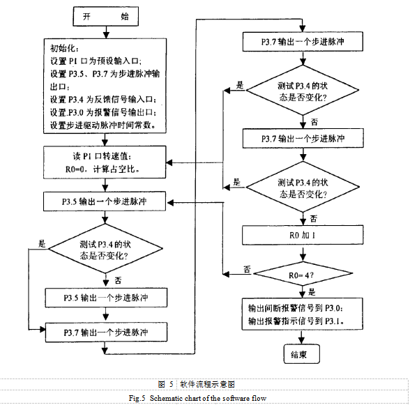 本機軟件采用查詢方式工作。通過即時讀取撥盤開關(guān)的 8 位數(shù)據(jù),以定寬調(diào)頻的方式, 通過修改步進電機的占空比 ,來調(diào)整步進電機的轉(zhuǎn)速 ,并在每步步進信號發(fā)出后,通過檢測霍爾元件的反饋信號達到監(jiān)控步進電機的轉(zhuǎn)動狀態(tài)的目的。軟件流程如圖 5 所示。
